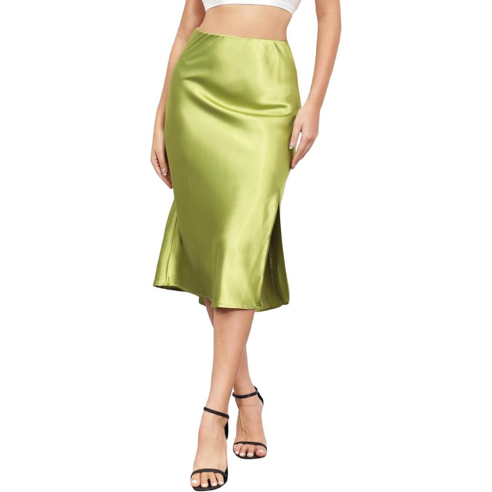 ALCEA ROSEA Women High Waist Silky Satin Midi Skirt Elastic Waist A Line Skirt with Slit(1951-apple Green)