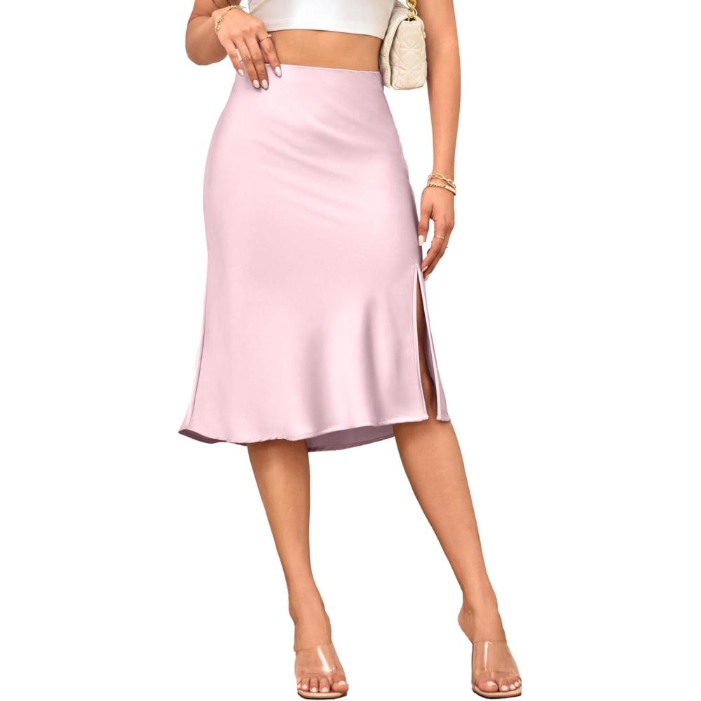 ALCEA ROSEA Women High Waist Silky Satin Midi Skirt Elastic Waist A Line Skirt with Slit(Pink)