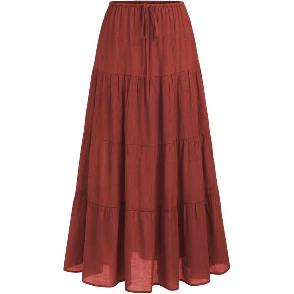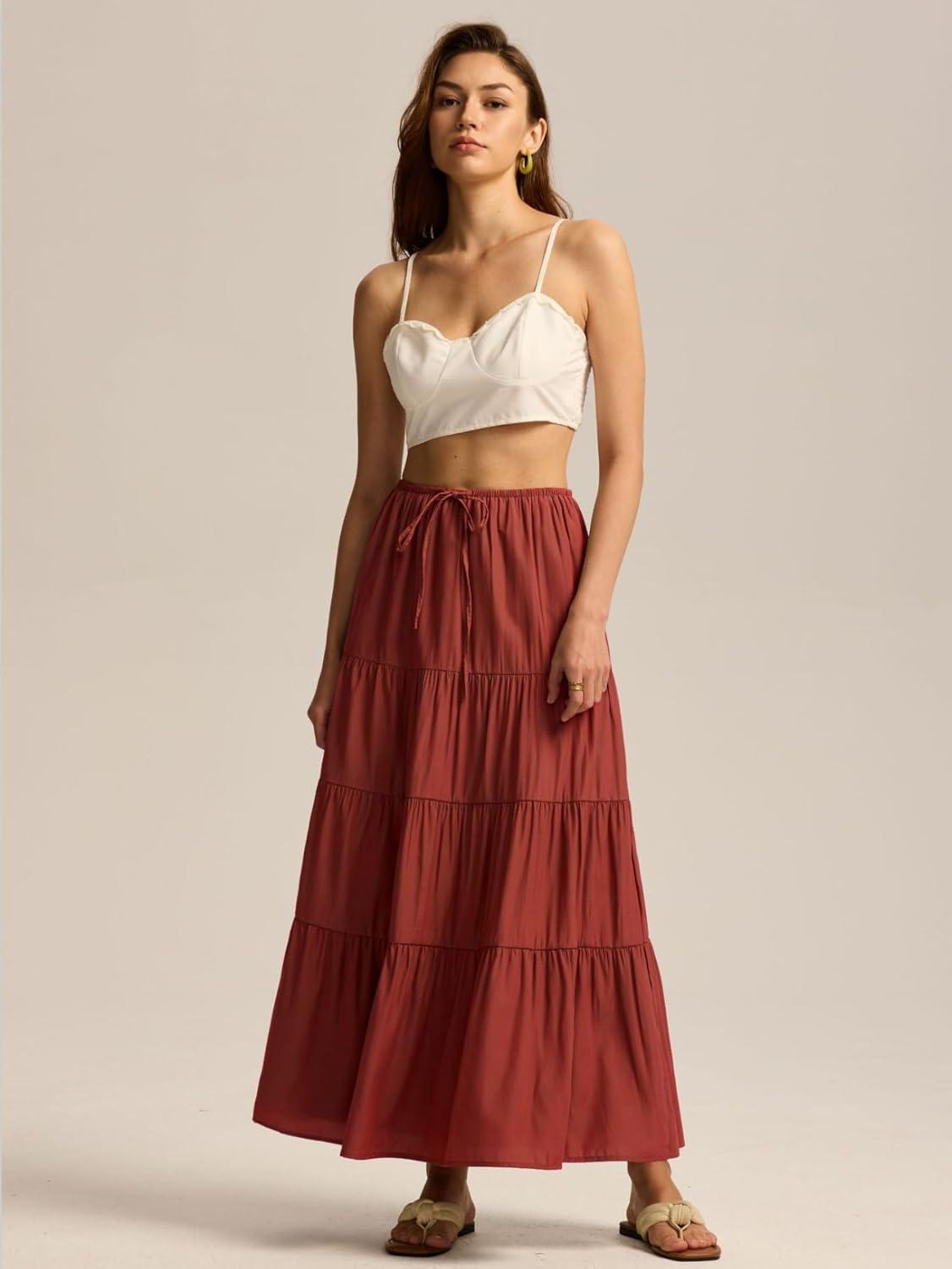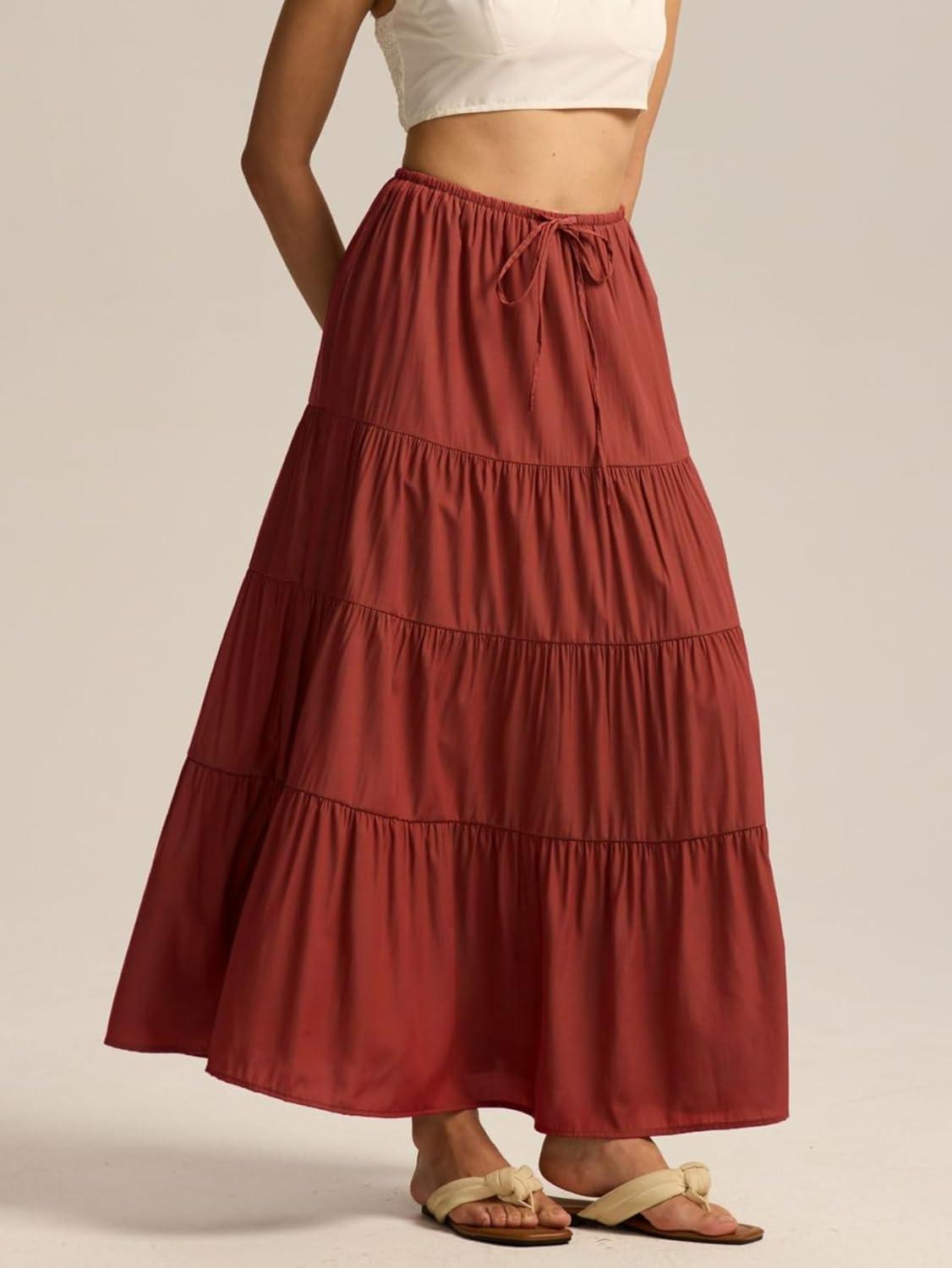 ALCEA ROSEA Women’s Boho Tiered Maxi Skirt Elastic High Wasited Flowy Ruffle Beach Vacation Summer Long Skirt with Pocket7889(Brown)