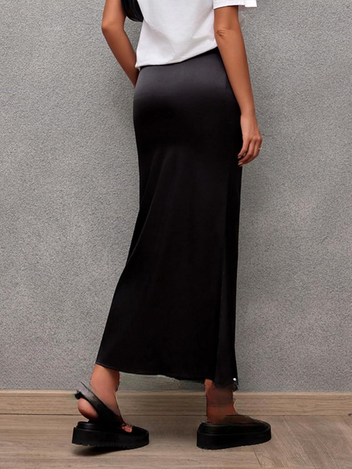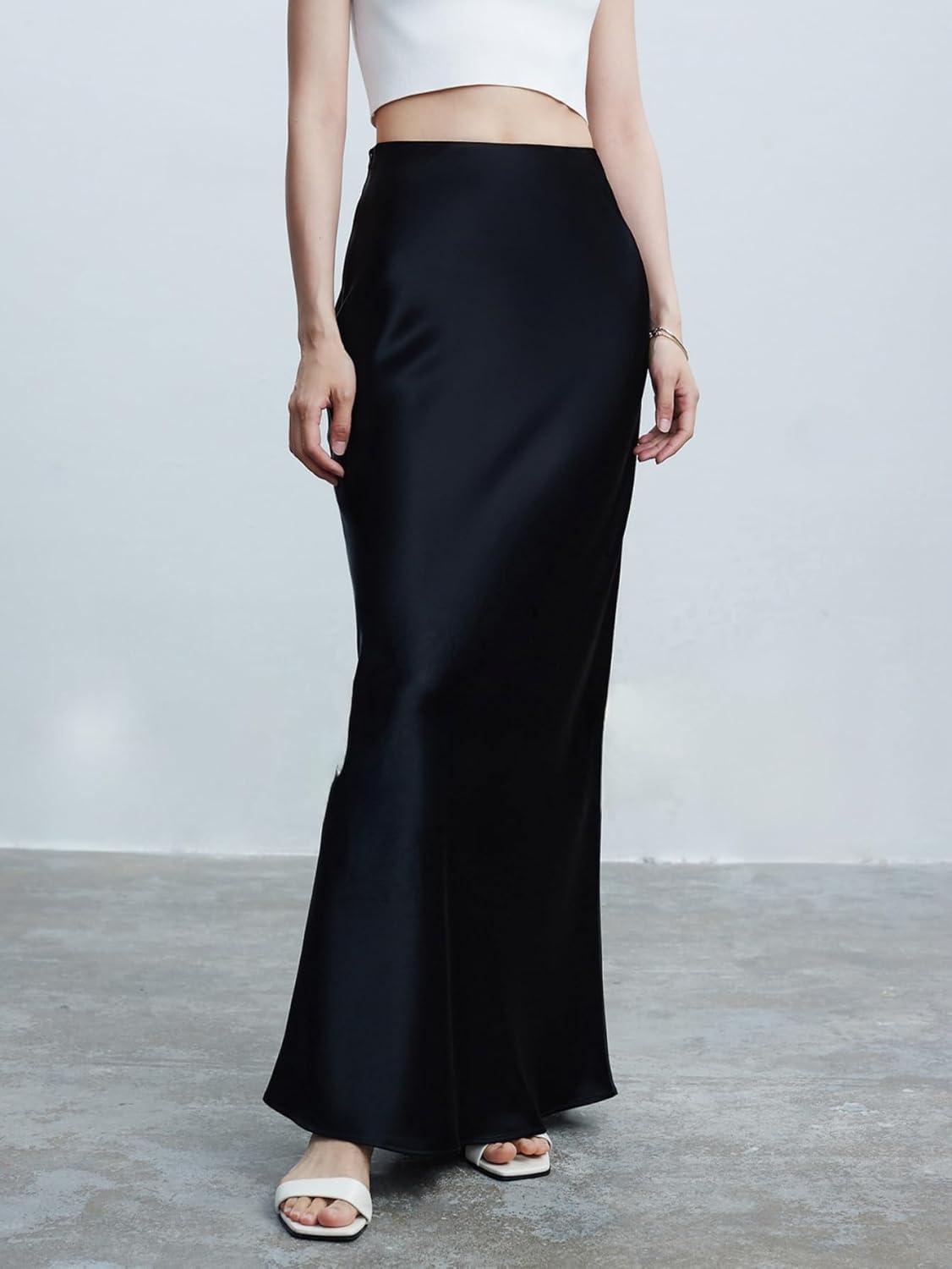 ALCEA ROSEA Womens Silky Satin Maxi Skirt Elegant High Waisted Long Pencil Ladies Skirts for Office Work Party 7867(Black)