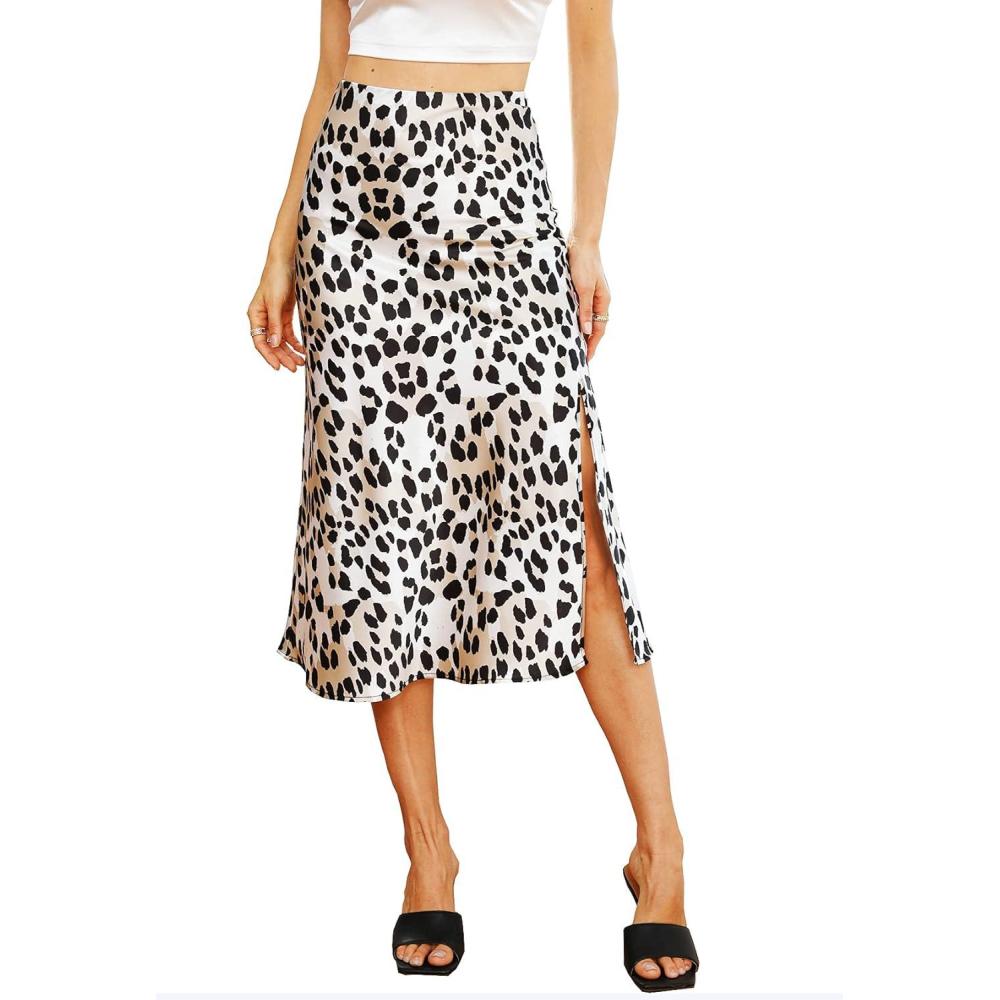 ALCEA ROSEA Womens Silky Satin Midi Skirt High Waist Elastic Waist A Line Skirt with Slit(Leopard)